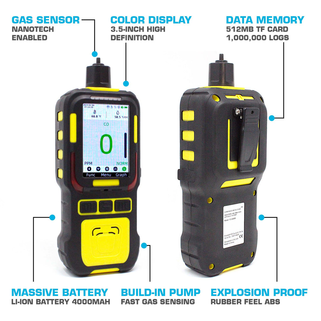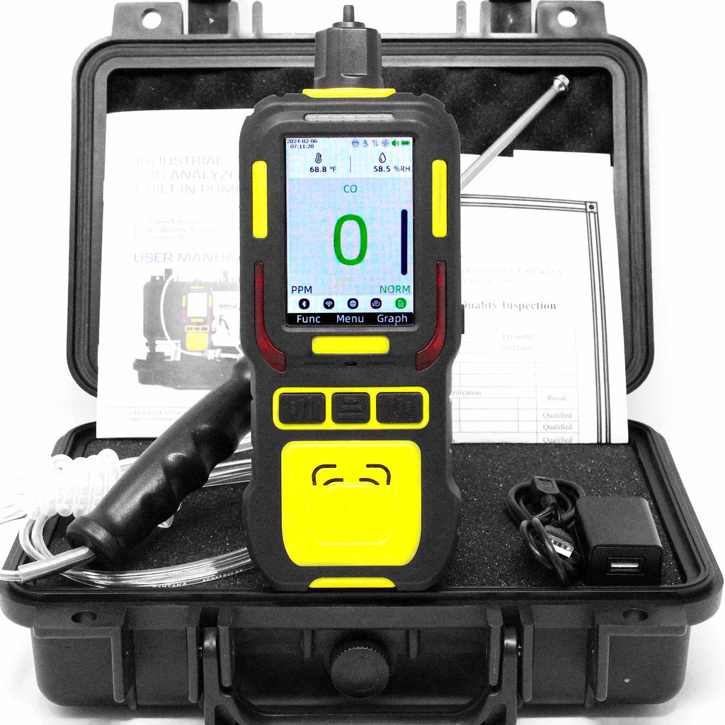 Ten potężny analizator ma wbudowaną pompę umożliwiającą bardzo szybkie wykrywanie i reakcję oraz jest wyposażony w 4ft sondę idealną do pobierania próbek gazu w pomieszczeniach lub na zewnątrz. Klienci używają go do monitorowania poziomu tlenku węgla w pomieszczeniach oraz do lokalizowania wycieków tlenku węgla. Detektor jest śledzony i skalibrowany według standardów USA NIST w Los Angeles. Jeśli potrzebujesz prostszego detektora CO, polecamy nasz przenośny miernik CO. Do zastosowań motoryzacyjnych i analizy spalania upewnij się, że wybierasz odpowiedni analizator tlenku węgla. Dla inspektorów domów, którzy nie potrzebują funkcji rejestratora danych, zalecamy bardziej przystępny cenowo analizator tlenku węgla.