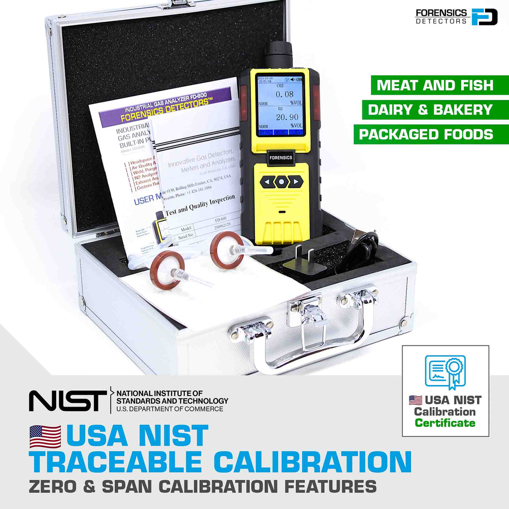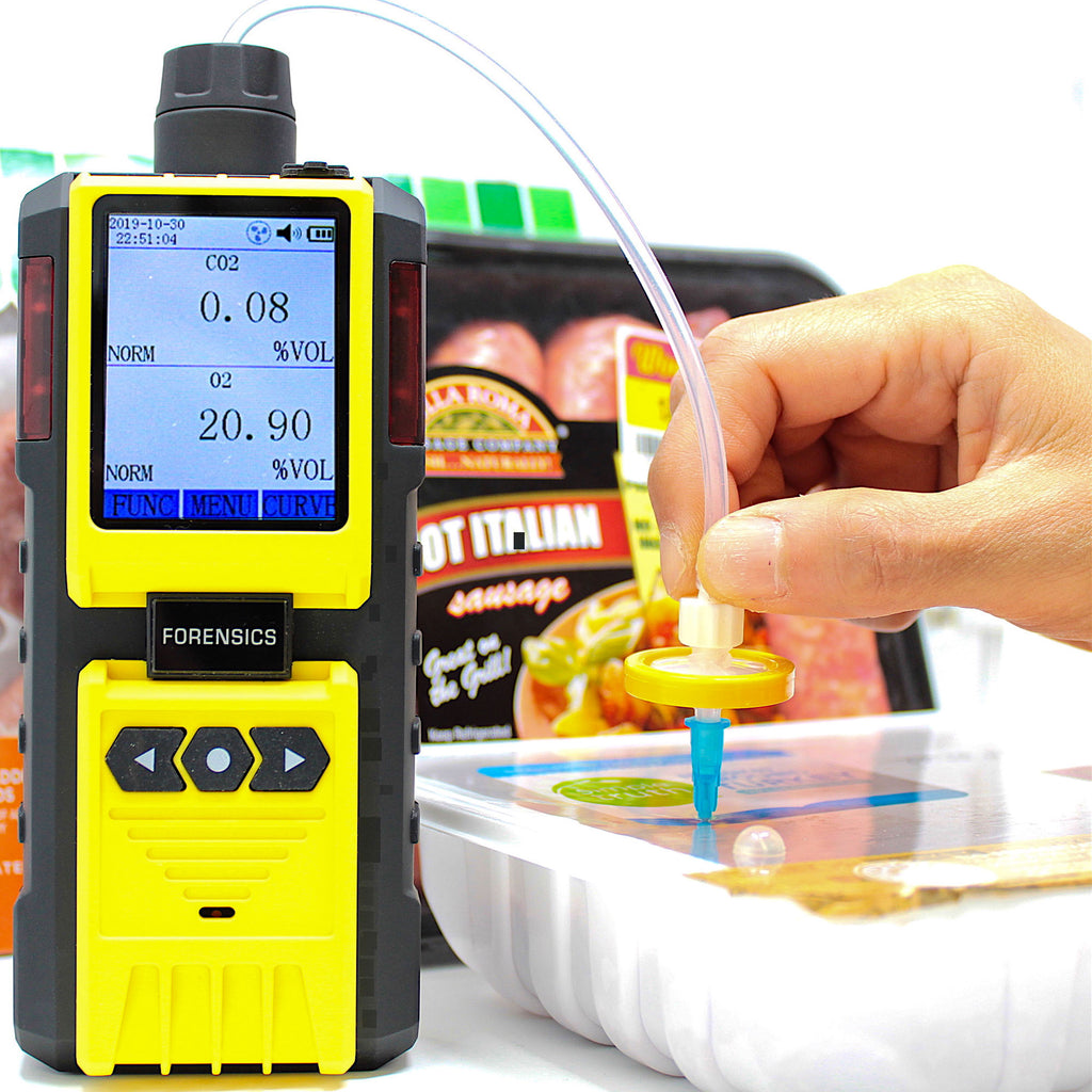 Details: Our CO2 and O2 analyzer is the perfect solution to your packaging analysis problems. The headspace analyzer investigates your modified atmosphere packaged (MAP) products to measure oxygen and/or carbon dioxide-modified levels. The FORENSICS CO2 and O2 analyzer is an excellent option with intuitive usage. Based on our industrial analyzer platform, this analyzer includes a built-in pump that is easy to use and very portable. Simply insert the needle tip of the probe into the food pack through a septa seal pad. The septa device provides a tight seal and prevents air from leaking into the package through the puncture hole. With full user control, the built-in pump draws in the small or large quantity of sample air required for analysis. The pump can be turned off at any time to sample the right amount of air, as packaging headspace varies from product to product. Comes with a color screen, large digits, and on-screen real-time graphing. The detector is constructed with an advanced electrochemical oxygen sensor. The internal 32-bit microprocessor allows for user calibration, ON/OFF flow, and test control. Typical testing takes less than 30 seconds.