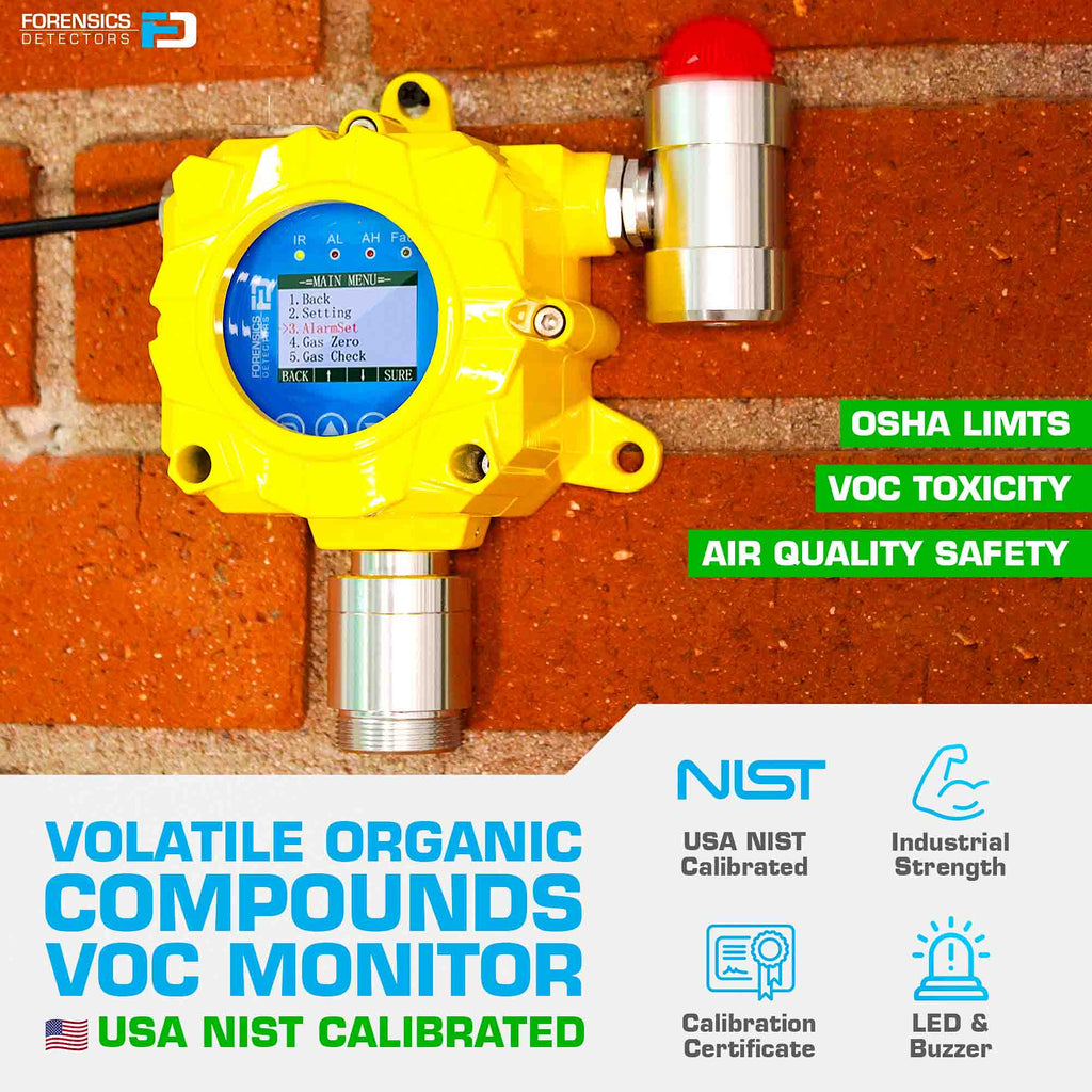 Details: This is the Forensics Detectors heavy-duty, wall-mounted Volatile Organic Vapors (VOC) gas detector for continuous indoor monitoring. The fixed detector can switch on/off electrical equipment up to 50W each relay power by setting low and high alarms to trigger relays, perfect for fan control, ventilation control, and other devices. The unit is factory calibrated to NIST Traceable VOC (isobutylene) source to assure you of accuracy. High precision for accurate monitoring within an indoor space, industrial, small business, manufacturing, cleanrooms, research and development, VOC exposure control, and occupational safety applications. Equipped with a VOC electrochemical sensor and comes factory-calibrated.